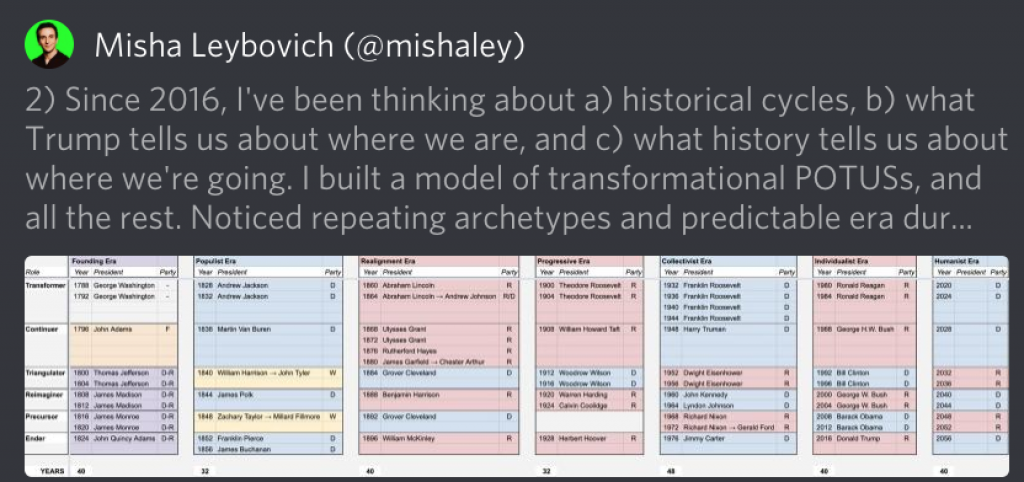 In tandem with the memetic marketing blitz, Leybovich tweeted a spreadsheet manifesto, wherein he outlines a comically sophistic theory of historical change. In it, presidents push the country through a series of Transformative Eras (Founding, Populist, Realignment, Progressive, whatever), presumably with the power that only Great Men can wield. Their sheer force of personality turned the wheel of the epochs! Following the beacon of their visionary leadership, America progressed teleologically through a series of discrete chapters into which each presidency can be neatly sorted. Tragically, the tides of history have washed up on the polluted shores of the Individualist Trump era. But this nadir is destined to be erased as the Humanists are swept back into power, led, of course, by Elizabeth Warren and her memes.