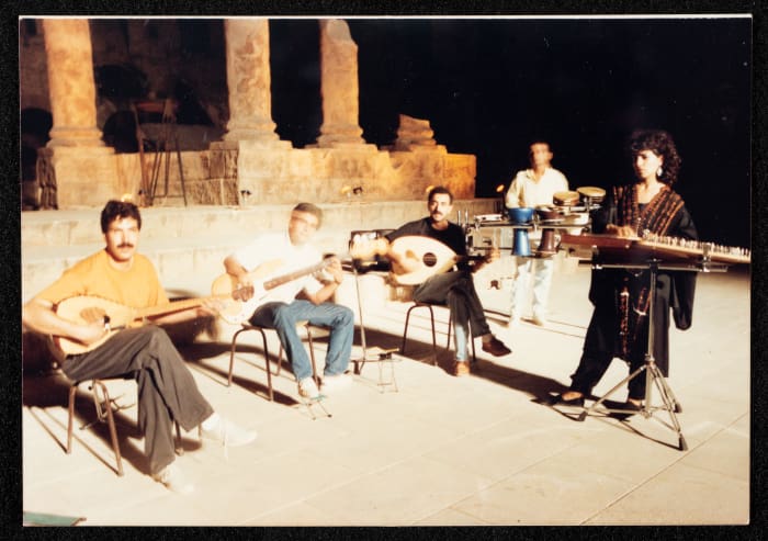 In 1980, a band called Sabreen, meaning “Still Patient,” or “The Patient Ones,” was formed by a group of Palestinian musicians. Sabreen began to experiment with combining Western and Arabic styles and instruments in their music. They regularly incorporated Palestinian poetry into their lyrics, drawing on poets such as Mahmoud Darwish, Hussein Barghouthi, and Fadwan Tuqan, daughter of Ibrahim Tuqan. Sabreen’s first single, “Dukhan al-Barakin” (“Smoke of the Volcanoes”), featured lyrics by Palestinian poet Samih al-Qasim. Its release coincided with the 1982 Israeli invasion of Lebanon, the Sabra and Shatila Massacre, and the siege of Beirut. “Tell the world about the home whose lantern they broke,” Sabreen sang. The band eventually transformed into a non-profit organization that promotes Palestinian music, paving the way for more Palestinian musicians and bands to express the traumas and triumphs of struggle in their own voices.