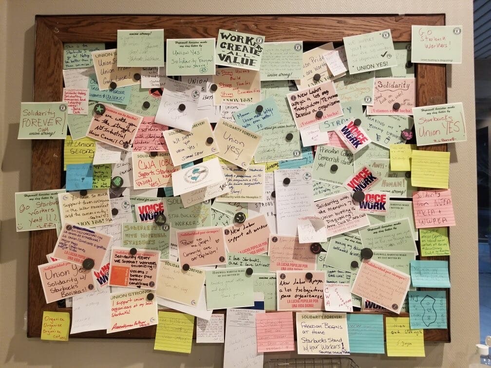 At the Starbucks in Hopewell where Mughal has been organizing, customers and “partners” alike have shown up wearing Starbucks labor union pins. Members of other labor unions have stopped by to write down messages of support and pin them on the main blackboard. Supporters hand out buttons and encourage customers to order their drinks under the name #UnionStrong. Workers from Hopewell have also shown outward solidarity to other stores across New Jersey that are choosing to file for union elections of their own.